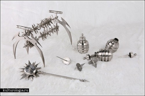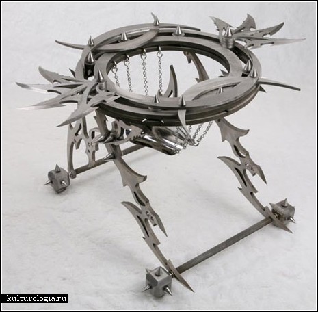И чего тут только нет! и детская кроватка, и лошадка-качалка и даже погремушка. Увидев такое, многие могут прийти в восторг, все-таки все эти вещи ассоциируются с каким-то фильмами ужасов или, на крайний случай, с фантастикой. Только вот отнюдь не для детей созданы эти продукты. Они выполнены из нержавеющей стали, потому и кажутся такими опасными, но не только из-за этого. В каждой вещи есть острые части, о которые даже взрослый человек может порезаться, что уж говорить о ребенке. Хотя если вы хотите, чтобы ребенок с детства был приучен к сложностям и трудностям, был закален и впоследствии вырос воином – именно такие игрушки и могут подойти для соответствующего воспитания.