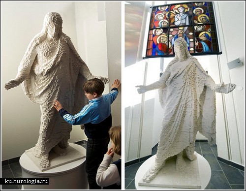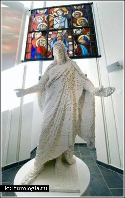 В Швеции приняли решение установить на время Пасхи в одной из церквей фигуру Иисуса Христа. Казалось бы, что в этом может быть необычного? А то, что фигура собрана из кубиков Лего. Она составляет около двух метров в высоту, то бишь такого же роста, как и все взрослые люди. На создание статуи ушло около 30,000 кубиков Лего, а занимались этим сорок добровольцев. В течение 18 долгих месяцев они трудились, строили статую, следуя мельчайшим деталям, дабы образ получился натуральным, максимально приближенным к настоящим фигурам. Специально были использованы кубики лишь одного цвета, а не разноцветные, дабы инсталляция не походила на расписную куклу. Интересно, что статуя является точной копией той, что когда-то воздвиг шведский скульптор Bertel Thorvaldsen. Увидеть статую можно в одном из соборов Копенгагена.