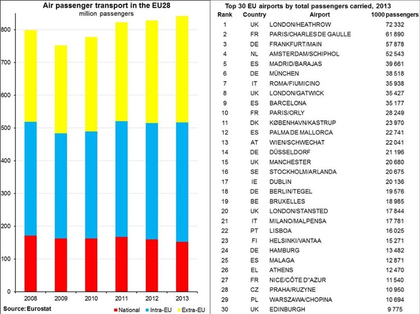 Самым загруженным по объему пассажиропотока аэрохабом в ЕС в 2013 году остался Лондонский Хитроу, с 72 млн обслуженных пассажиров. Это на 3,4% больше в сравнении с данными за 2012 год.