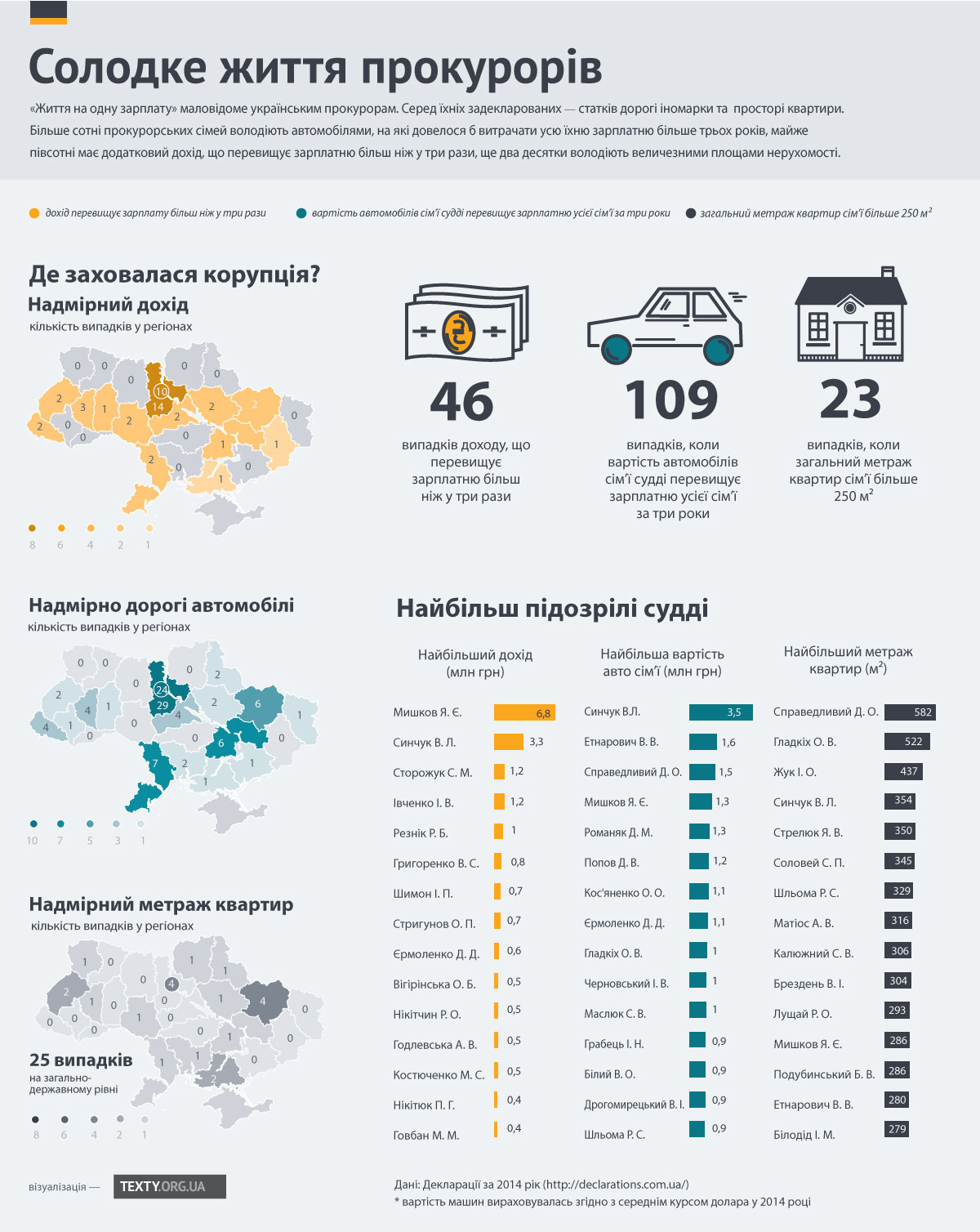 Так дохід суддів у 46 випадках перевищує їхню зарплату в три рази, у 109 випадках вартість автівки перевищує дохід судді та всієї його родини за три роки, і кількість прокурорів, у яких більше ніж 250 квадратів житла становить 23 випадки.